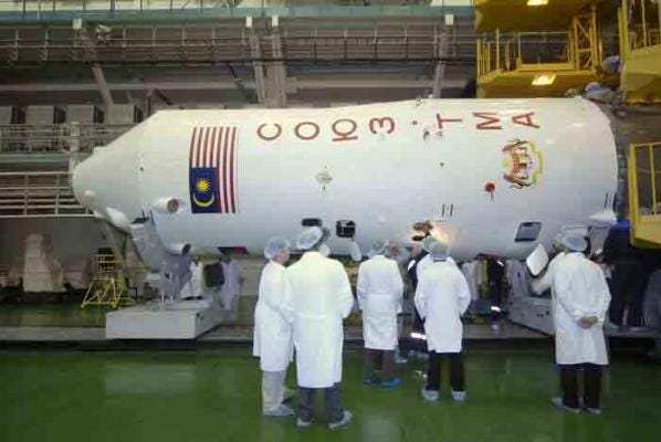 The Soyuz TMA-11 rocket, adorned with the Malaysian flag (Jalur Gemilang) and coat of arms (Jata Negara), was transported from assembly to the launch pad. Russian engineers applied finishing touches, including installation of the emergency rescue system.